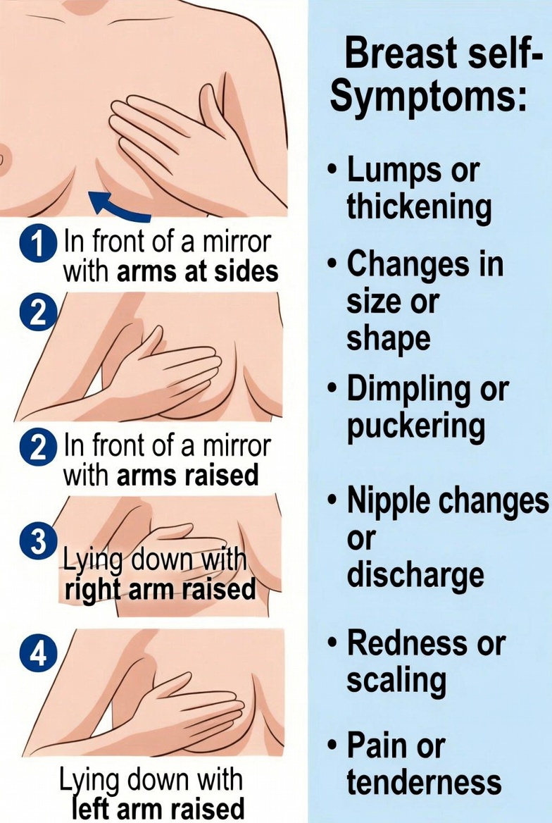 Állj tükör elé, karok lazán az oldalad mellett. Nézd meg a melleid alakját, méretét, szimmetriáját. Figyeld, van-e behúzódás, narancsbőr-szerű gödröcskék, pirosság, duzzanat.